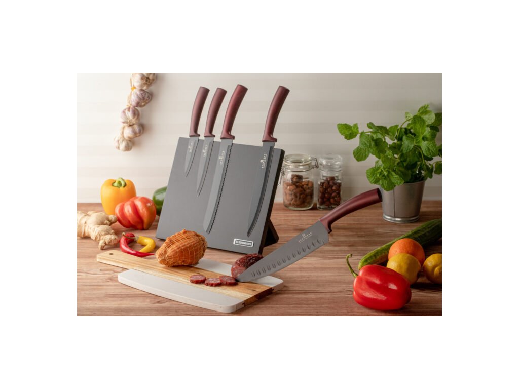 Tato 6dílná sada nožů s magnetickým stojanem je ideální pro každého, kdo chce mít ostré, bezpečné a praktické nože vždy po ruce. Elegantní bordó rukojeť navíc dodává kuchyni moderní a stylový vzhled.