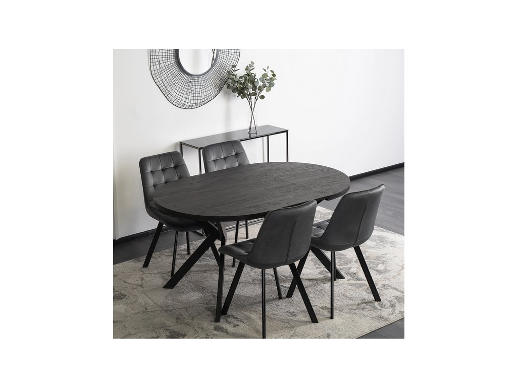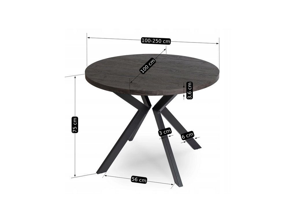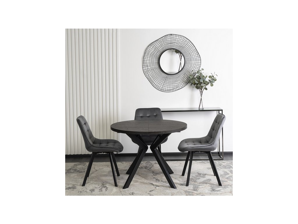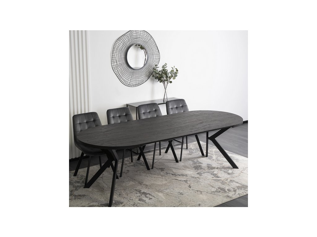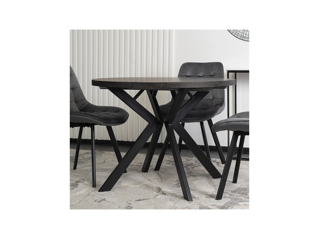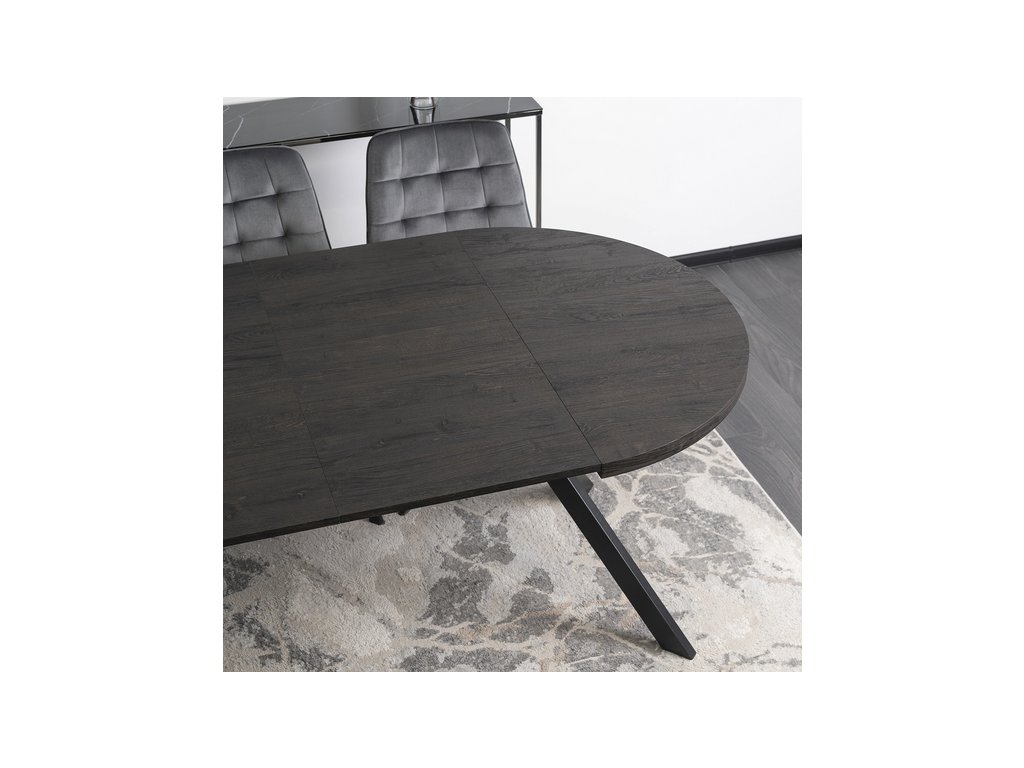 Elegantní roztahovací, rozkládací jídelní stůl PERSEUS v dekoru dub černý s černýma nohama. Rozložíte jej od 100 cm až po 250 cm, takže nabízí flexibilitu pro malé i velké prostory. Perfektní stůl do jídelny, kuchyně i moderního obývacího pokoje, restaurace, kavárny.