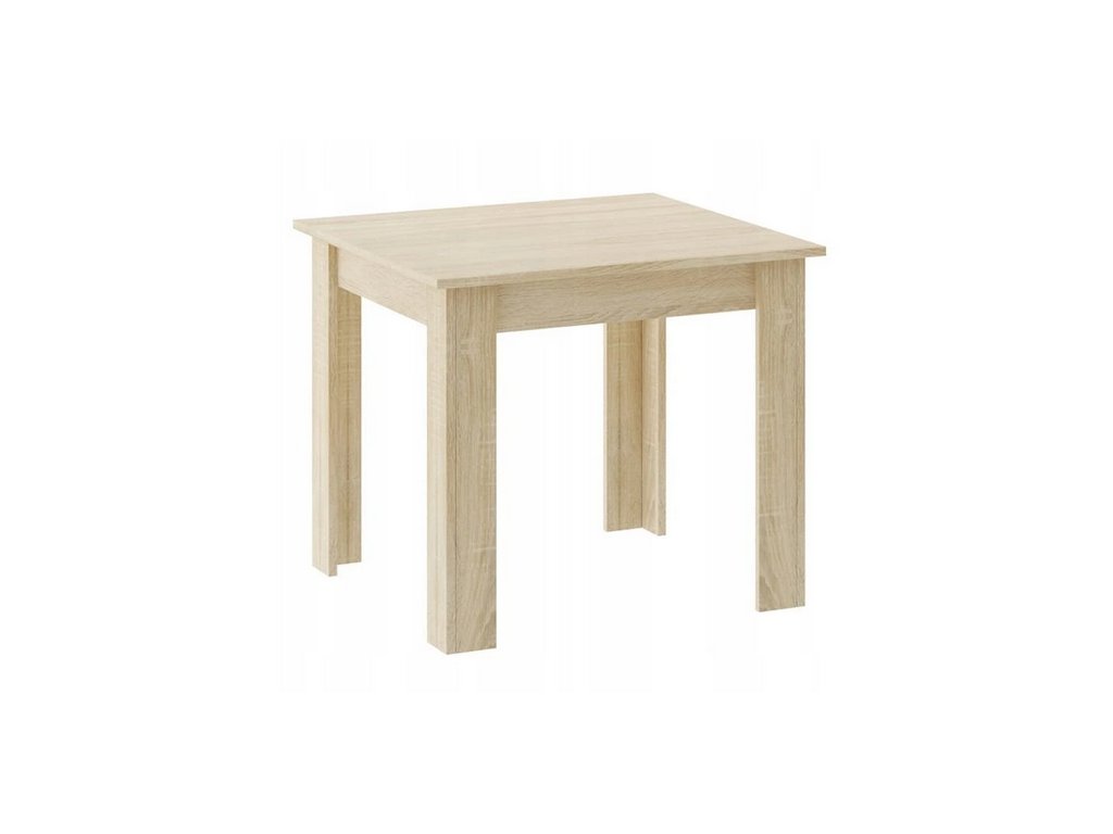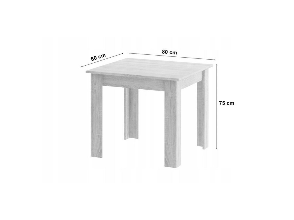 Stůl o rozměrech 80 × 80 cm v dekoru dub sonoma V kombinaci s bílými židlemi vzniká elegantní kontrast, který dodává celé sestavě moderní a sofistikovaný vzhled.